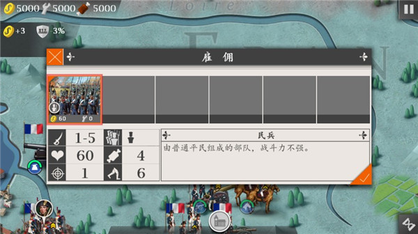 需要注意的一點(diǎn)是,軍力有輕步兵、擲彈兵、輕騎兵、民兵等,在移動(dòng)時(shí)盡量多查看兵種信息,移動(dòng)到同等軍力或比自己弱的敵人附近,增強(qiáng)攻擊、降低傷害。