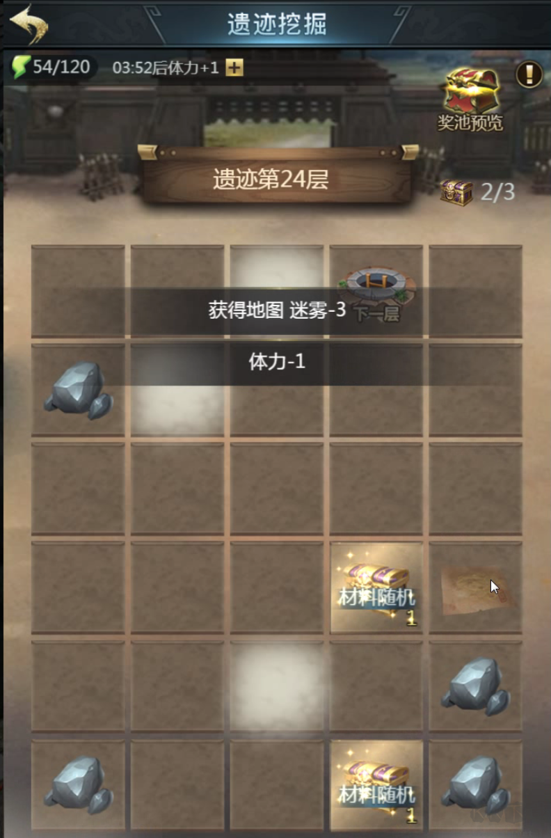 2、探索一次消耗一點(diǎn)體力,體力隨時(shí)間恢復(fù),當(dāng)下一層入口的迷霧被驅(qū)散時(shí),可進(jìn)入下一層。