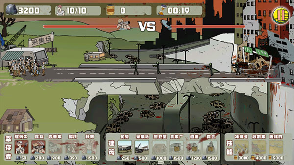 你可以生產(chǎn)廠房增加人口上限,可以招募工人、火槍隊(duì)、戰(zhàn)車來對(duì)抗僵尸,目的就是防御好自己的基地,并且拆除僵尸盤踞的大樓。如果想要更好的對(duì)抗僵尸,建造能夠生產(chǎn)資金的廠房是必不可少的,當(dāng)你擊敗僵尸獲得的積分累計(jì)到一定程度時(shí),還可以施放積分大技能,對(duì)僵尸軍團(tuán)進(jìn)行一次大沖擊哦?。?/p>