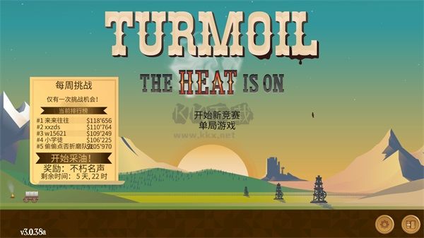 隨著19世紀(jì)石油工業(yè)的爆發(fā),石油開采變成了一項極其熱門的活動。在石油騷動電腦中文版中,玩家將扮演一名隨石油開采熱潮出現(xiàn)的創(chuàng)業(yè)者,在這座地下資源尚未開發(fā)的小鎮(zhèn)上,憑借智慧,與時間賽跑、與對手競爭,品嘗開采石油的帶來的果實,并征服小鎮(zhèn),成為新一任鎮(zhèn)長。作為16年發(fā)售的游戲,無論從畫風(fēng)還是界面布局來看,都帶有濃濃的復(fù)古氣息,2D畫面和UI,很容易讓人聯(lián)想起20年前的Flash神作黃金礦工。游戲畫面極具特色,人物、建筑和背景板,都帶有一絲北美風(fēng)情。本作的配樂格外出色,從不同地圖到不同游戲階段,數(shù)十首音樂都會伴隨整個游戲。雖然畫面以如今的眼光看來不怎么出眾,但這并不能阻止它成為一款內(nèi)容豐富且足夠耐玩的策略游戲。石油騷動3dm免費版的基礎(chǔ)玩法非常簡單,單局游戲通常只需要3至10分鐘。玩家要在有限的時間內(nèi),盡可能的開采所有地下資源,包括石油、天然氣,甚至鉆石,再通過銷售賺取資金。當(dāng)熟練掌握了開采技術(shù)之后,那么經(jīng)營石油交易也就變成了一項挑戰(zhàn)。玩家只有有限的起始資金,但勘探資源、建設(shè)鉆井卻要不少花銷。在獲得穩(wěn)定收入之前,若有不慎,就只能扛起利息高昂的貸款。當(dāng)然,足夠精明的玩家,也可利用貸款獲取更大的利潤。