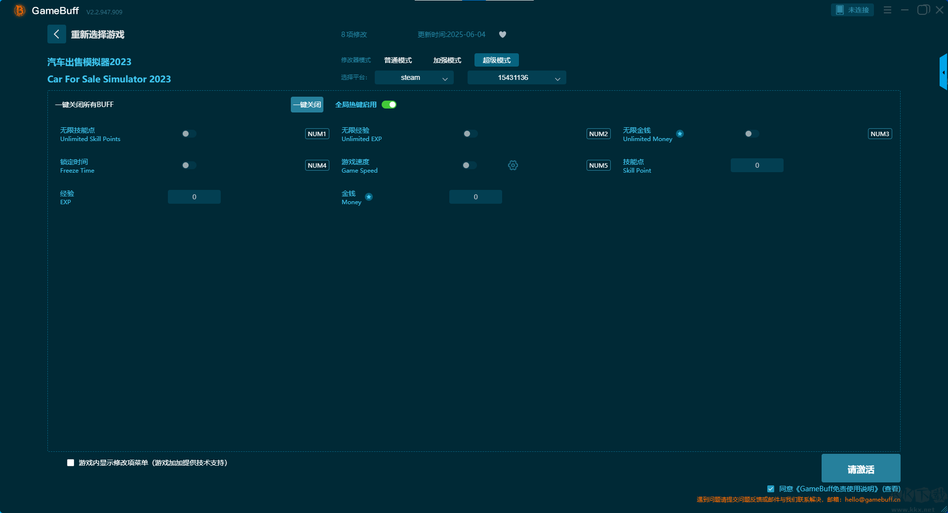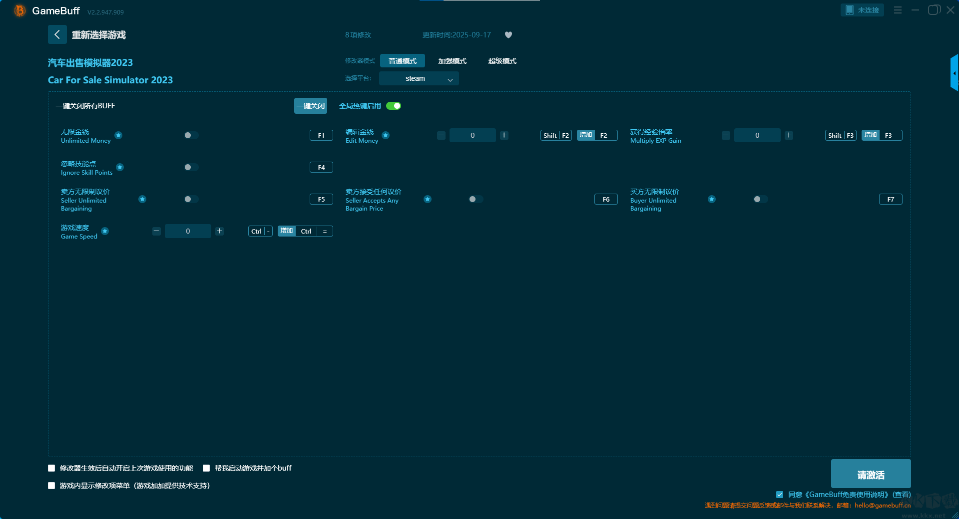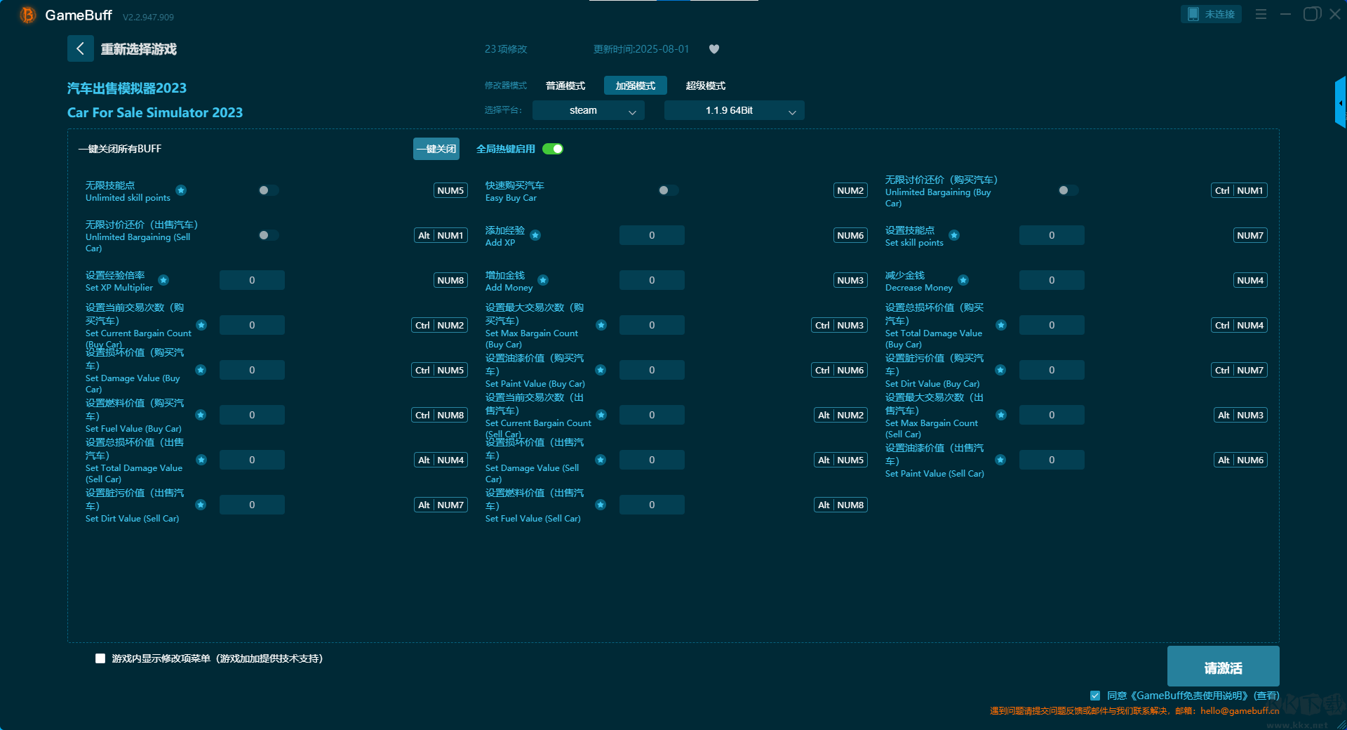 Car For Sale Simulator2023八項修改器pc完整版是一款專門為游戲Car For Sale Simulator2023所制作的游戲輔助工具。這款工具的功能十分強大無限金錢、忽略技能點、賣方無限議價、游戲速度、編輯金錢、獲得經(jīng)驗倍率、賣方接受任何議價、買方無限期議價八項普通模式功能,你可以在游戲中自由設(shè)置快捷鍵綁定,一鍵開關(guān)所有功能。需要的小伙伴快來下載使用吧。