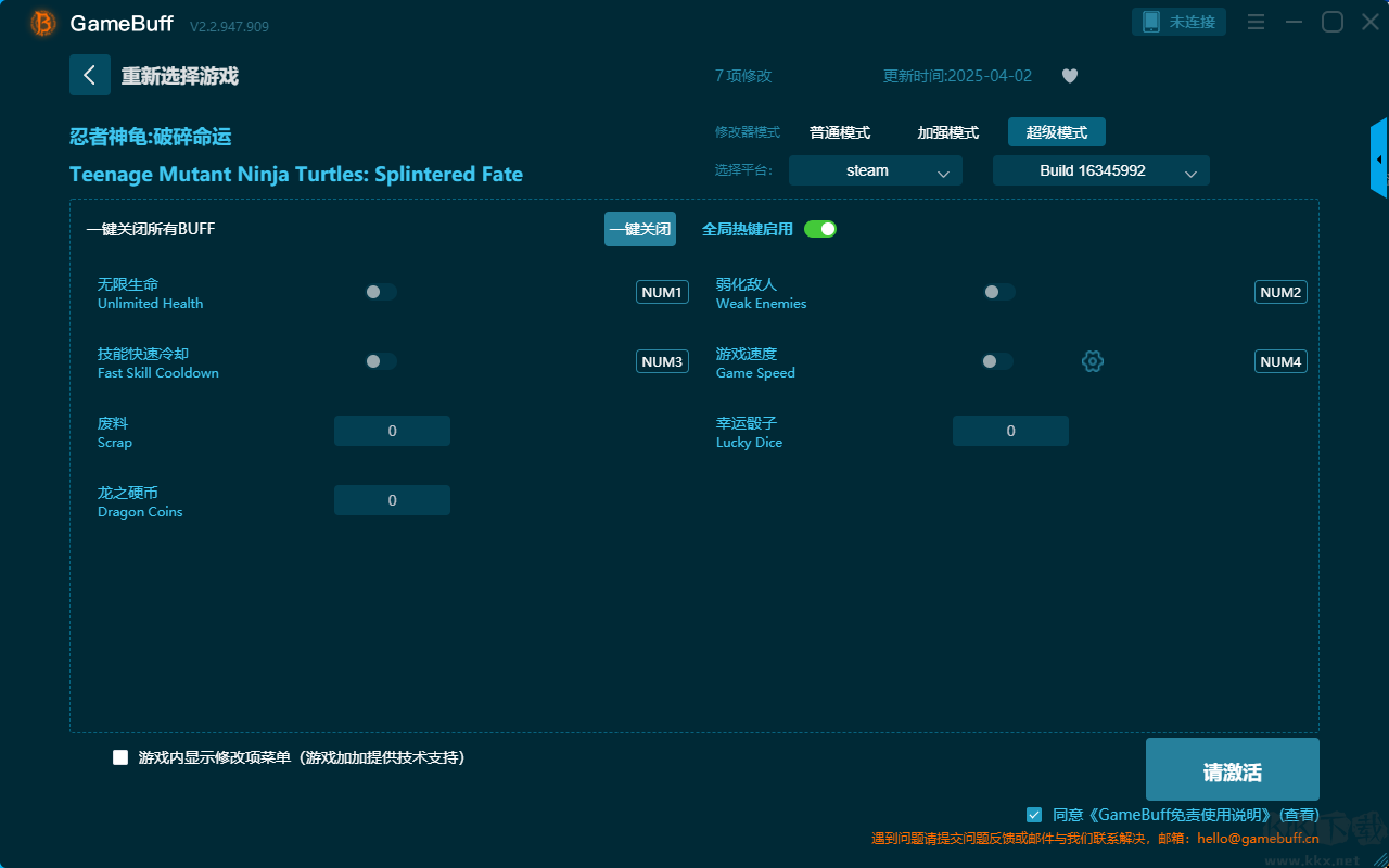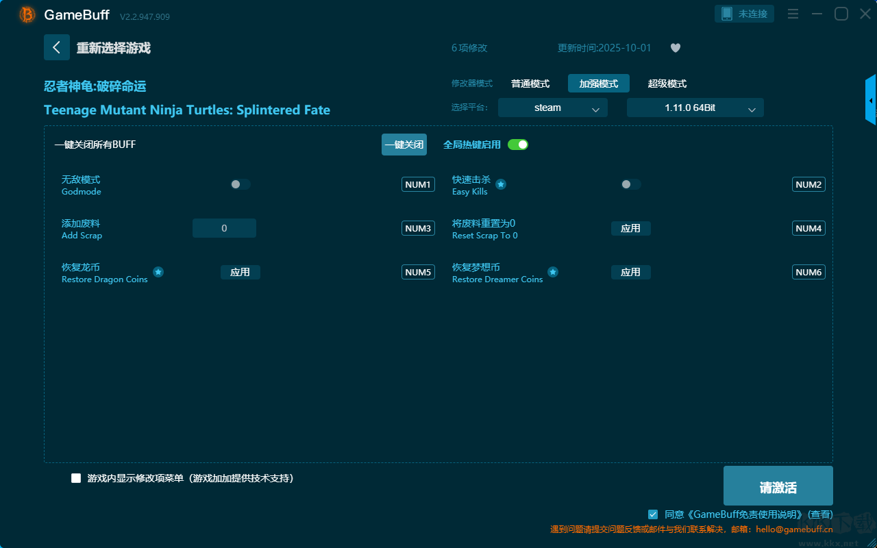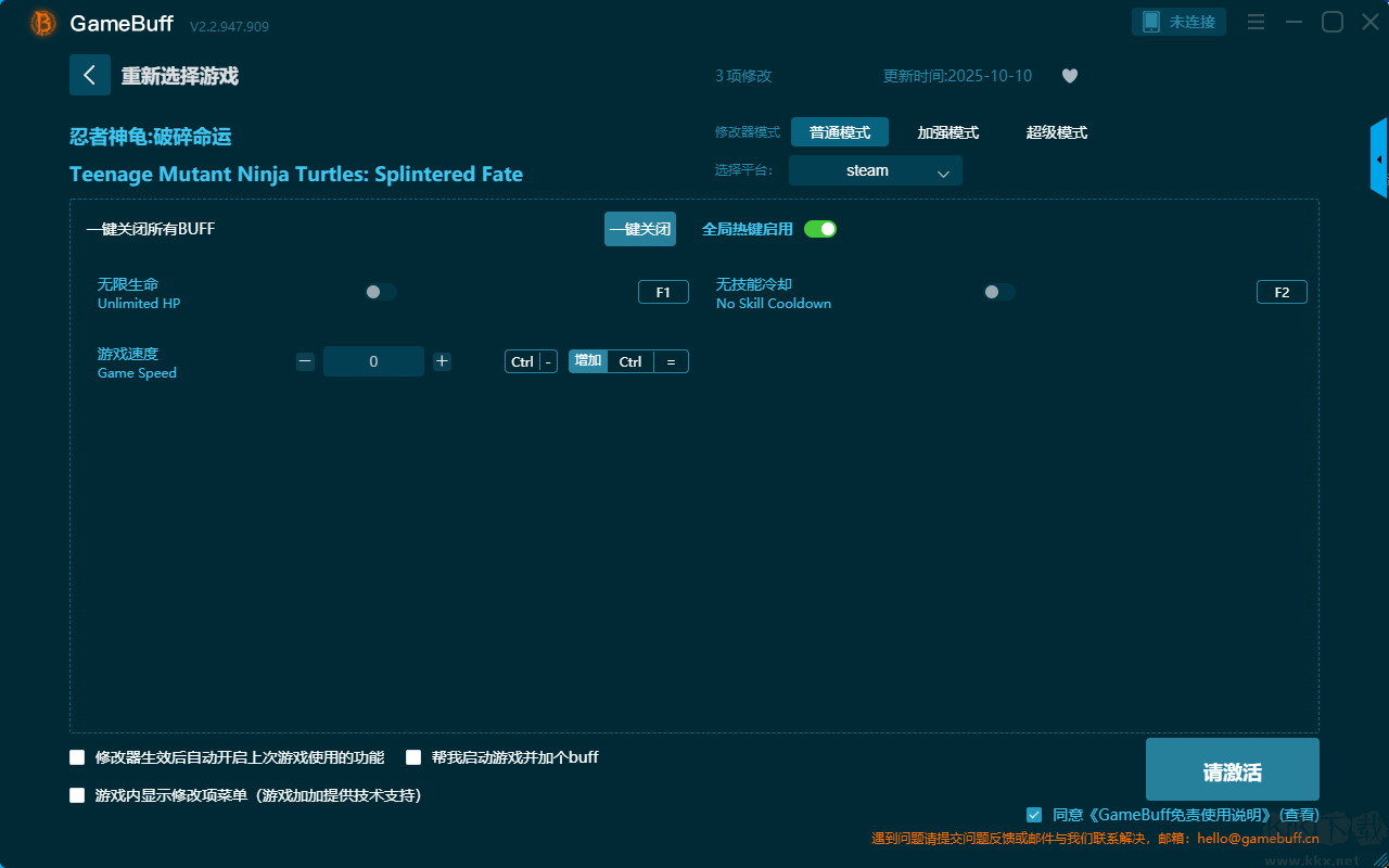 忍者神龜破碎命運(yùn)三項(xiàng)修改器pc官方版是一款使用且功能強(qiáng)大的游戲輔助修改器。玩家可在游玩過程中在普通、加強(qiáng)、超級(jí)等三個(gè)模式中選擇啟動(dòng),其中超級(jí)模式支持為游戲開啟無限生命、技能快速冷卻、弱化敵人、幸運(yùn)骰子、廢料、龍之硬幣、游戲速度七項(xiàng)強(qiáng)大功能。喜歡的小伙伴快來KK下載站下載體驗(yàn)吧。