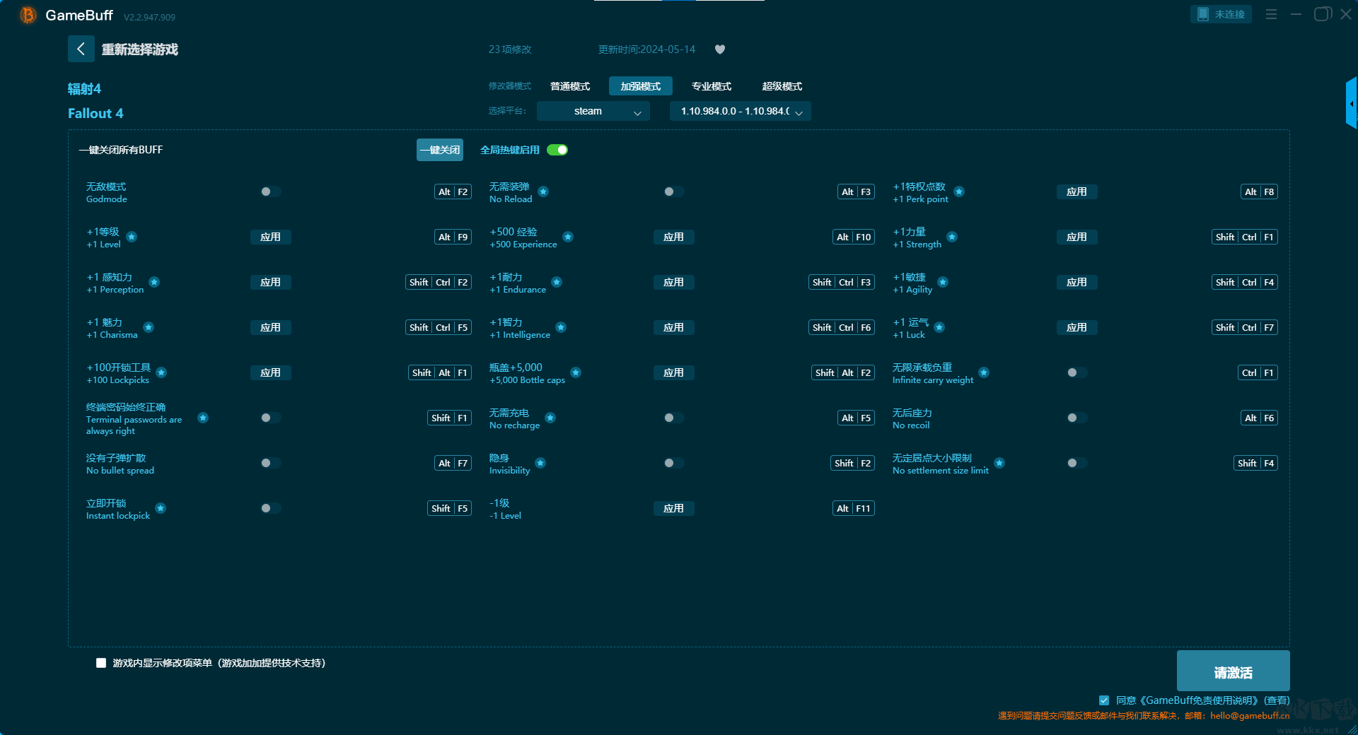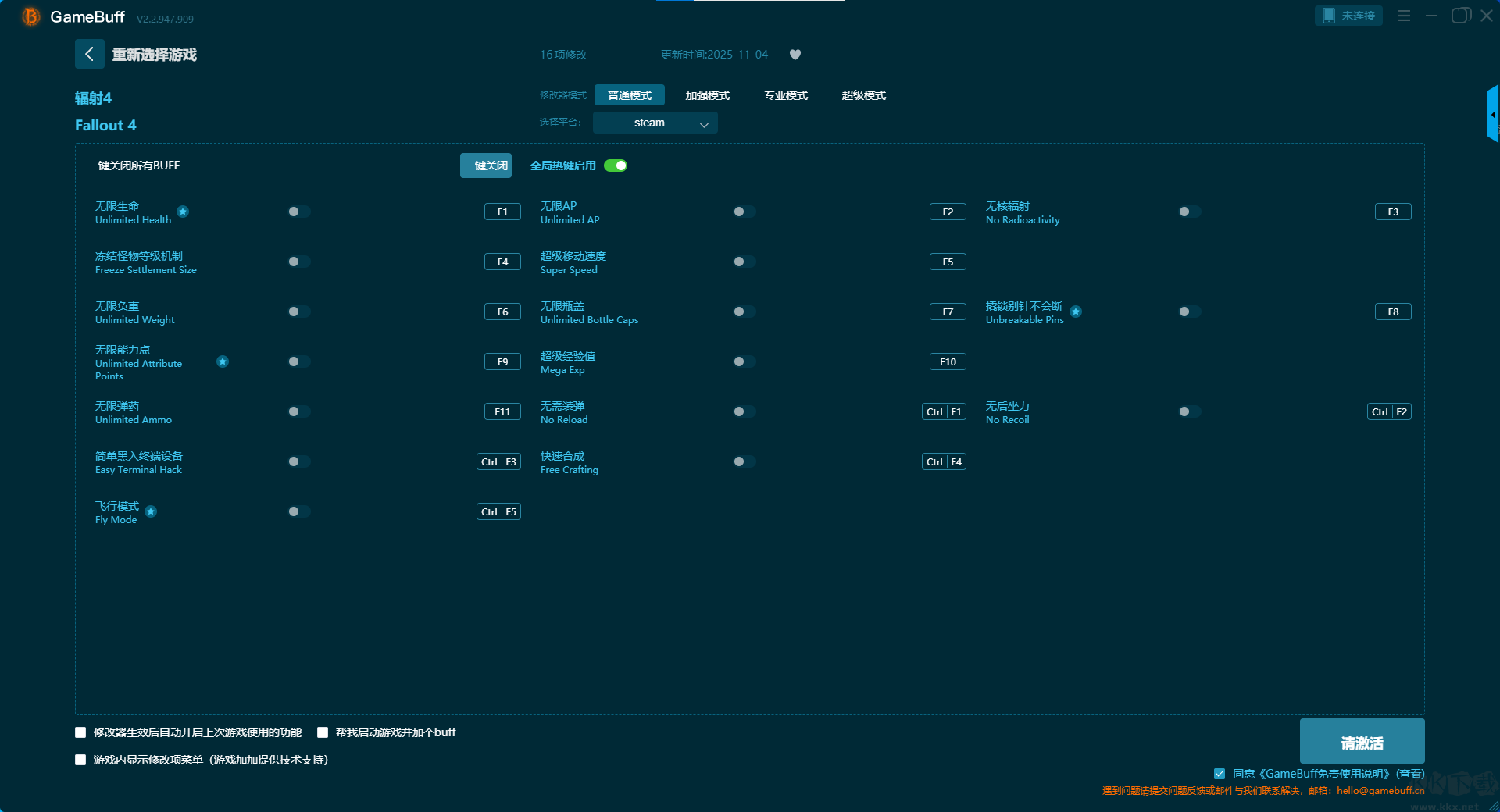 輻射4十六項(xiàng)修改器pc重置版是一款專業(yè)的游戲輔助工具。玩家可在游戲輻射4游玩過程中開啟輔助,支持在steam,uwp等平臺(tái)上使用。玩家可一鍵開啟,無限生命、無限 AP、無核輻射、凍結(jié)怪物等級(jí)機(jī)制、超級(jí)移動(dòng)速度、無限負(fù)重、無限瓶蓋等16項(xiàng)普通模式修改功能。需要的小伙伴快來KK下載站下載這款修改器體驗(yàn)一下吧。