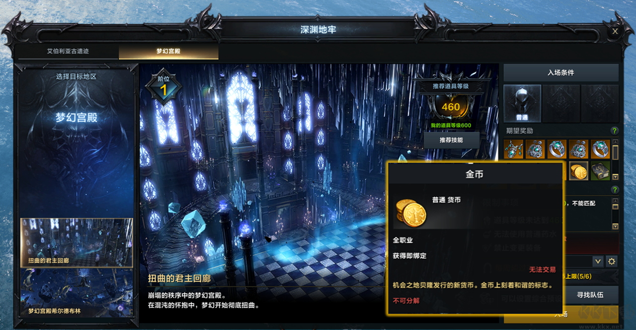 每周每個角色可通關一次深淵地牢(最多6個角色),通關后可獲得固定的80金獎勵。每個賬號每周最多有六個角色可以獲取該獎勵。如果通關兩個艾博利亞古遺跡和兩個夢幻官殿的周本,一個角色每周可獲得320金(6個角色1920金)