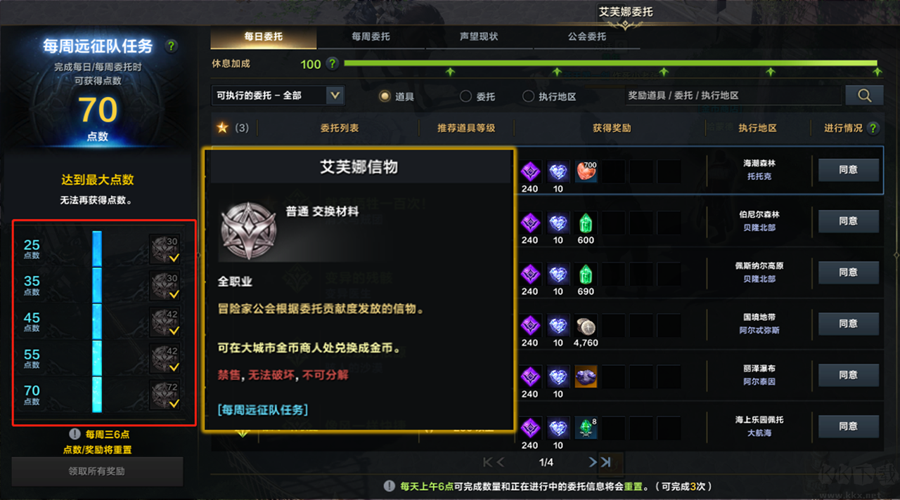 完成每日和每周委托任務可獲得點數(shù)。達到70點后可以領取艾芙娜的證明,在主城的金幣商人處兌換金幣袋子正常運氣下可獲得1000金甚至更多。