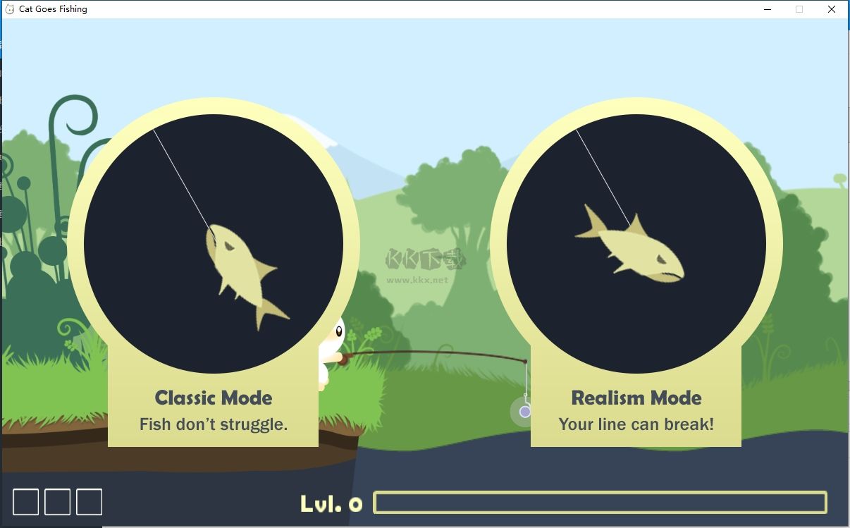 2、初次進(jìn)入游戲,有兩種模式可以選擇,一個(gè)是經(jīng)典模式,魚不會(huì)掙扎;另一個(gè)是寫實(shí)模式,你的線可能會(huì)斷;