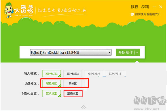 1、雙擊打開大番薯u盤啟動盤制作工具,在左下方窗口選擇“智能模式”,然后將準(zhǔn)備好的u盤插入電腦的usb接口,大番薯會自動識別u盤,點擊“開始制作”旁下拉菜單,選擇“u盤分區(qū)”欄相關(guān)進行制作的模式,若想個性化設(shè)置的朋友可點擊“高級設(shè)置”,個性化設(shè)置過程可參考:”大番薯u盤啟動個性化設(shè)置教程“,如圖所示: