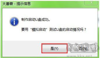 4、u盤啟動盤制作完成后,會彈出一個大番薯信息提示窗口:“制作啟動u盤成功,要用模擬啟動測試u盤啟動情況嗎?”我們點擊“是”測試制作完的u盤啟動盤是否可用。