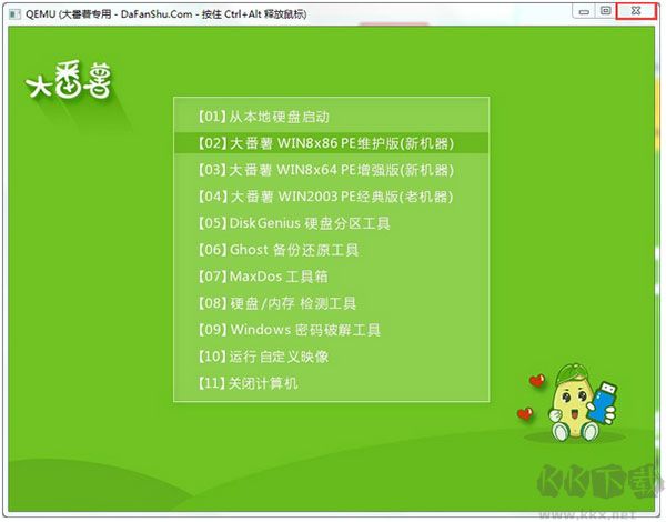 5、若看到u盤啟動盤在模擬環(huán)境下的正常啟動界面,說明u盤啟動盤制作成功(注意:模擬啟動界面僅供測試使用,請勿進一步操作),最后按組合鍵“Ctrl+Alt”釋放出鼠標(biāo),點擊右上角的關(guān)閉圖標(biāo)退出模擬界面,如圖所示: