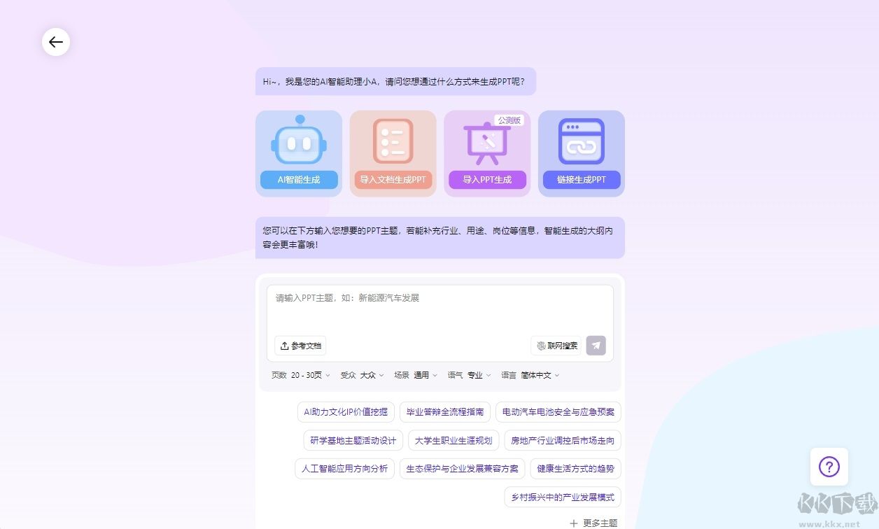 AiPPT(PPT制作工具)是一款智能PPT制作工具,只需要輸入PPT主題或導入Word、Markdown等文檔,就能一鍵生成含大綱、文案和配圖的完整演示文稿,還支持在線編輯生成后的PPT,比如修改文本、圖表、模板等。內置超10w+專業(yè)模板及素材,涵蓋商務、教育、銷售等各行業(yè)PPT模板,能大幅降低PPT制作門檻,適用于職場、教學、營銷等多領域高效辦公。導入docx、xmind、freemind、markdown等格式,軟件可以一鍵將其轉化為PPT!需要的朋友快來下載試試吧!
