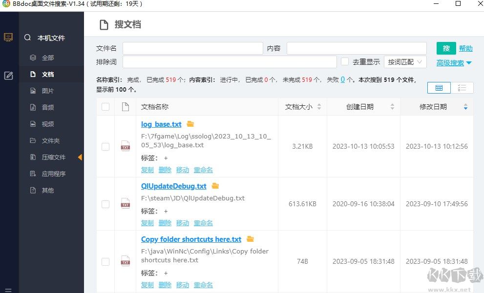 BBdoc(文檔搜索工具)是一款小巧,功能強(qiáng)大的文檔搜索軟件,能對(duì)電腦文檔的文件名和內(nèi)容進(jìn)行搜索,快速找到需要的文檔,搜索速度很快。它操作簡(jiǎn)單,設(shè)置好文檔類型、大小、名稱和內(nèi)容,就能對(duì)電腦里的文檔進(jìn)行掃描;掃描完成后可直接查看文檔,也能進(jìn)入文檔目錄。支持文件名、文檔內(nèi)容快速搜索,還能按文件類型、文件修改時(shí)間篩選,是日常辦公的好助手。還支持按文檔類型搜索,涵蓋word、pdf、Excel、壓縮文件、csv、wps、txt等;也支持按文件大小搜索,還能按文件大小排序。