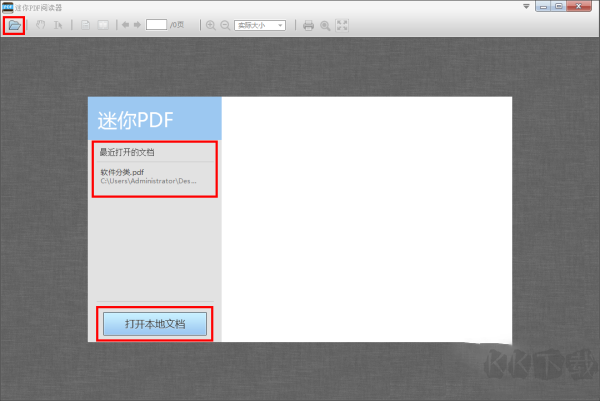 1、打開迷你pdf閱讀器后,點擊打開按鈕或者“打開本地文檔”來選擇你的文檔以打開PDF文檔。你也可以打開最近的文檔。