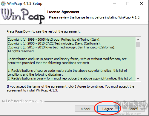 3、進入到WinPcap軟件使用協(xié)議界面,我們點擊界面下方的“I agree”選項進入下一步。