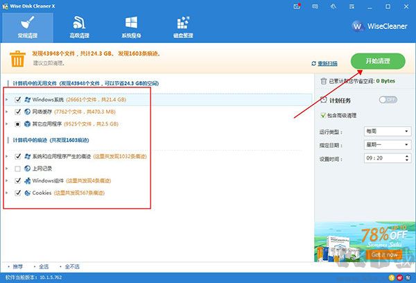 用戶可根據(jù)實際需求,設(shè)定每日、每周或每月執(zhí)行清理的計劃任務(wù)。Wise Disk Cleaner 將在后臺自動運行,清除臨時與無用文件。在設(shè)置中還可創(chuàng)建“一鍵清理”快捷方式,并放置于桌面。無需啟動主程序界面,直接點擊即可執(zhí)行清理操作。