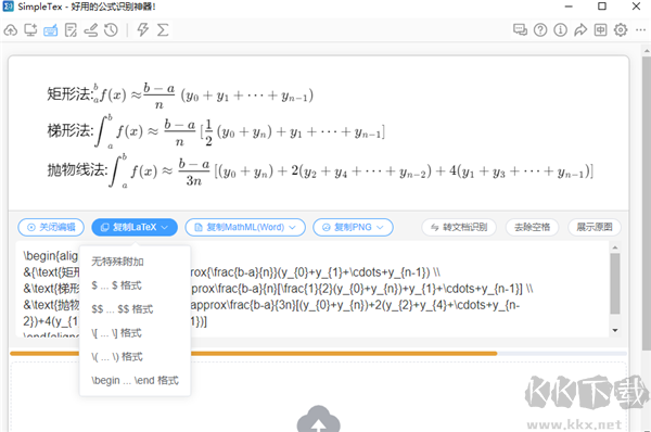 3、在完成公式識別后,SimpleTex允許以LaTeX、MathML(可直接粘貼至Microsoft Word)、PNG圖像等多種格式導(dǎo)出,便于靈活應(yīng)用于不同文檔編輯與排版環(huán)境。