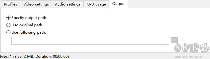 5、然后在界面下方找到“Output”選項(xiàng),該選項(xiàng)表示輸出目錄的意思,該選項(xiàng)下方有三個(gè)選項(xiàng),從上往下分別表示特定輸出目錄、原文件夾、自定義文件夾的意思,根據(jù)自己的需要進(jìn)行選擇即可;如果選擇自定義文件夾,則還要點(diǎn)擊下方的三個(gè)小點(diǎn)按鈕設(shè)置輸出目錄。