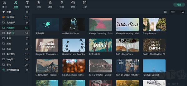 音頻庫包含超過50首曲目,風格覆蓋年輕潮流、柔和舒緩、搖滾激情、民謠清新、電子動感等類型,同時提供多種音效素材。
