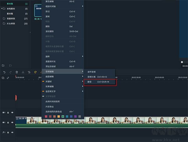 若需使視頻片段靜音,可右鍵單擊時間軸中的片段,選擇“靜音”。