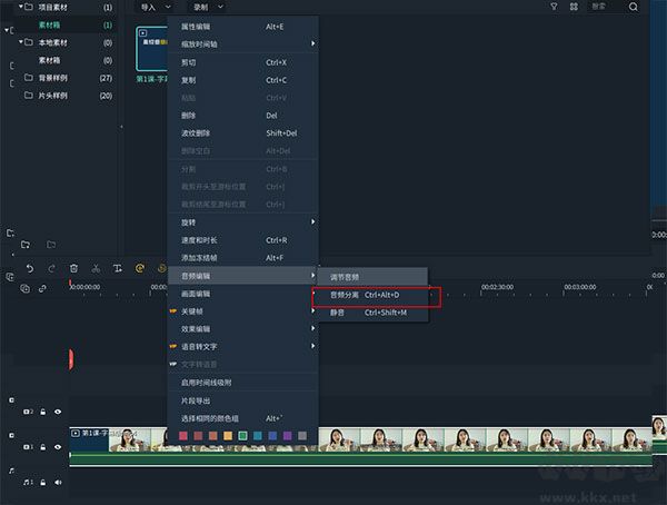 將視頻片段加入時間軸后,右鍵單擊并選擇“分離音頻”。音頻將被分離并自動放入聲音軌道。
