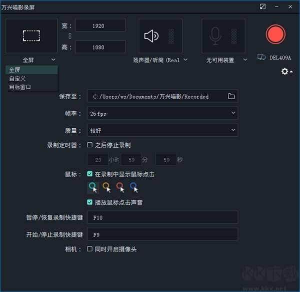 3、點擊下拉菜單根據(jù)需求選擇“全屏”、“自定義”或“目標窗口”。如需通過麥克風或系統(tǒng)聲音錄制,請點擊相應圖標。此外,開始錄制前可通過右下角設置選項檢查細節(jié)設置。