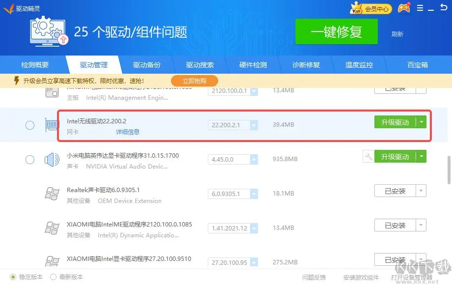 借助“一鍵檢測(cè)”功能,可輕松處理因網(wǎng)卡驅(qū)動(dòng)缺失導(dǎo)致的聯(lián)網(wǎng)故障??焖偕?jí)驅(qū)動(dòng)版本,讓游戲運(yùn)行更穩(wěn)定。
