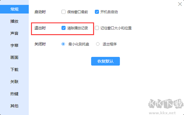 方法一:通過播放器右上角主菜單-設(shè)置面板-常規(guī)選項,選擇“退出時清除播放記錄”。