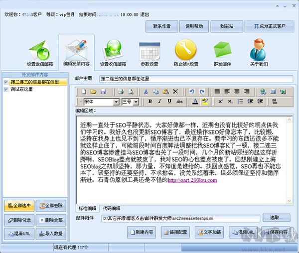 6、支持多媒體郵件、內(nèi)容變量替換、IP瞬時切換等功能;