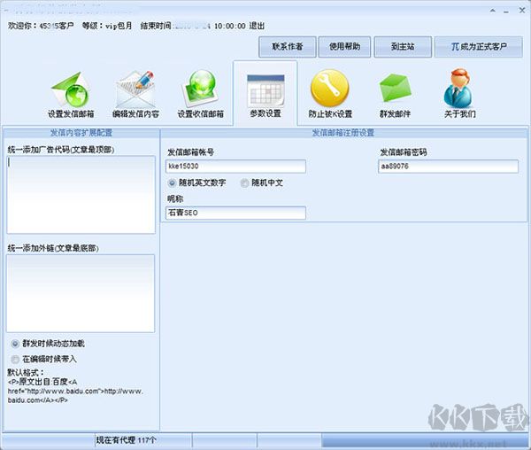 可在郵件內(nèi)容前后添加廣告代碼,設(shè)置發(fā)件賬號、密碼及發(fā)件人昵稱。