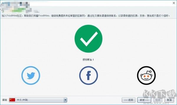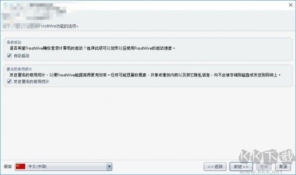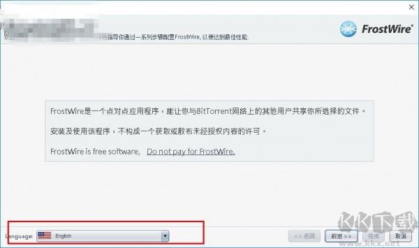 1、首先打開FrostWire,進(jìn)入軟件向?qū)Ы缑?,默認(rèn)語言為英文,可設(shè)置為簡(jiǎn)體中文;