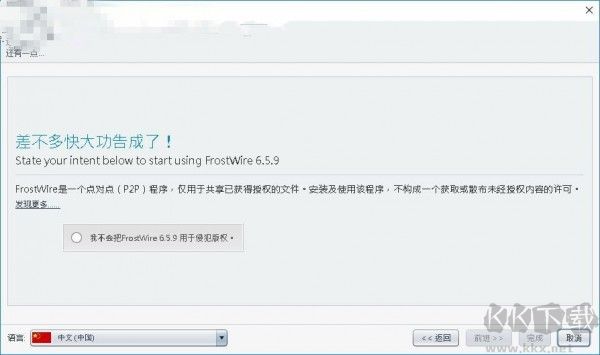 5、最后勾選“不會(huì)將FrostWire用于侵犯版權(quán)”選項(xiàng),即可進(jìn)入主界面;
