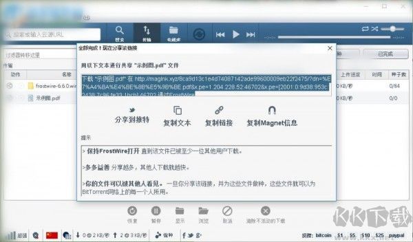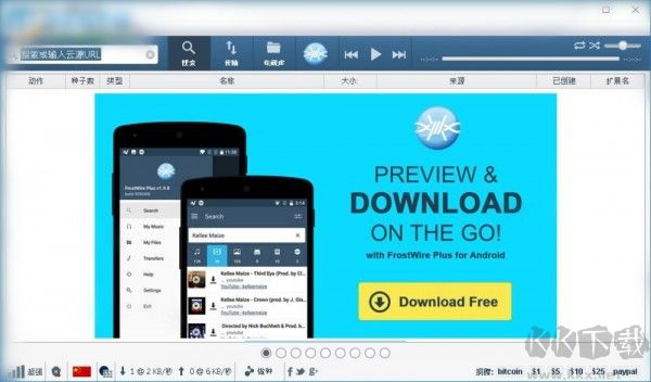 frostwire windows版是一款基于Limewire開發(fā)的實(shí)用P2P文件共享工具,簡(jiǎn)稱FW,相比Limewire使用體驗(yàn)更佳。軟件采用Java語言開發(fā),具有友好的用戶界面,不需要支付任何費(fèi)用就可以使用,支持用戶與BitTorrent網(wǎng)絡(luò)中的其他用戶共享自選文件。軟件在功能實(shí)現(xiàn)上與種子搜索工具較為相似,可輕松實(shí)現(xiàn)與朋友共享合作資源,包括MP3音樂、電影、圖片、游戲等多種類型的文件。frostwire還對(duì)傳輸機(jī)制進(jìn)行了優(yōu)化,能夠快速完成各類文件的傳輸,同時(shí)具備較高的安全性,可有效屏蔽存在風(fēng)險(xiǎn)的資源。