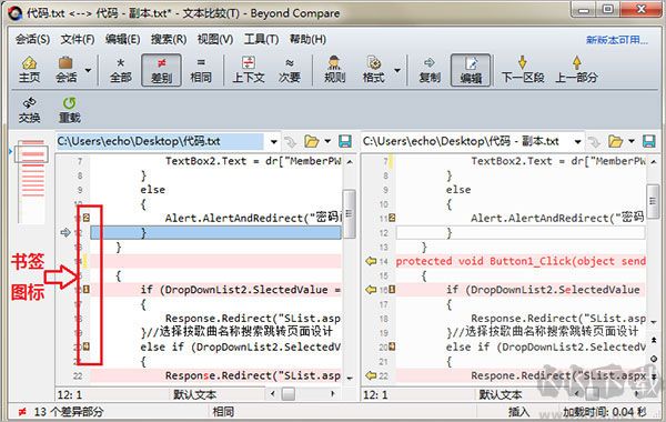 在文本比較左右兩側(cè)窗格中,差異部分以不同顏色標注顯示,如果您在修改文本差異部分時,有不確定的或者需要著重標注的就可以使用軟件提供的書簽設(shè)置來標記行信息。