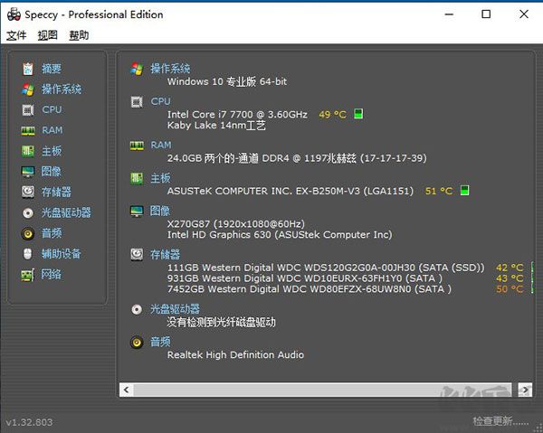 piriform speccy(硬件檢測(cè)工具)是一款實(shí)用電腦硬件檢測(cè)軟件,簡(jiǎn)潔輕便而且支持Windows操作系統(tǒng)。它能讓用戶查看電腦每一項(xiàng)硬件的詳細(xì)參數(shù),一鍵獲取CPU、主板、內(nèi)存、顯卡、硬盤(pán)、光盤(pán)驅(qū)動(dòng)器、音頻設(shè)備的型號(hào)與性能信息;軟件還可顯示不同硬件的溫度,方便用戶及時(shí)發(fā)現(xiàn)電腦問(wèn)題,十分好用。需要的朋友快來(lái)下載試試吧!