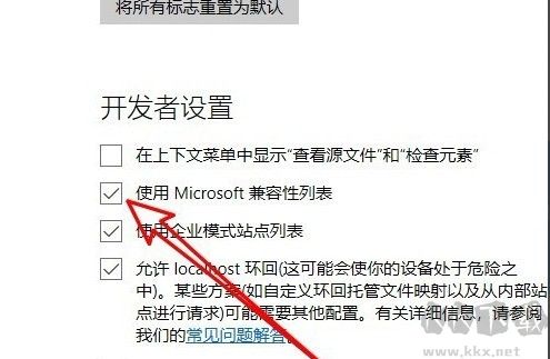 3、進(jìn)入Microsoft Edge瀏覽器設(shè)置頁(yè)面,找到“開發(fā)者設(shè)置”選項(xiàng),在此選項(xiàng)下找到“使用Microsoft兼容性列表”設(shè)置項(xiàng)。