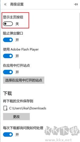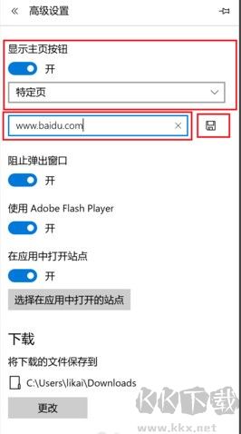 4、在高級(jí)設(shè)置界面中,找到主頁(yè)選項(xiàng)并將其開關(guān)設(shè)置為開啟狀態(tài),然后選擇“特定頁(yè)”,輸入要設(shè)置的主頁(yè)鏈接,保存即可。