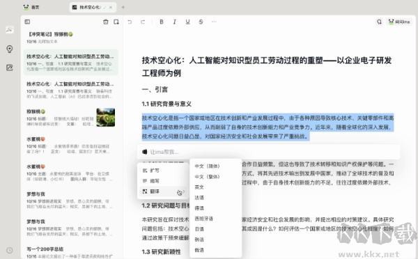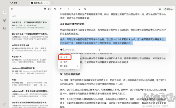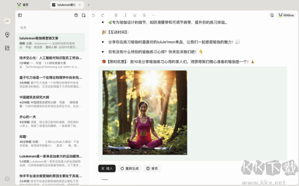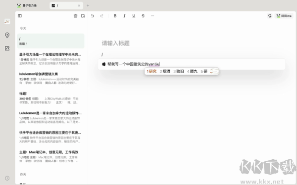 除基礎(chǔ)格式編輯、插入圖片、待辦清單等功能外,ima筆記還配備智能寫作能力,輸入斜杠即可快速激活A(yù)I輔助創(chuàng)作