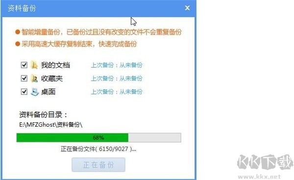 2、接著魔法豬會對您系統(tǒng)盤中的(一般系統(tǒng)盤為C盤)我的文檔、收藏夾和桌面資料進(jìn)行備份。備份的文件將會自動保存到您系統(tǒng)磁盤最大的分區(qū)中,名稱為X:\MFZGhost\資料備份文件夾中。在下面的進(jìn)度條中可以看到備份的進(jìn)度,一般備份在1-2分鐘之內(nèi)就可以完成。完成后會自動進(jìn)入下一步。