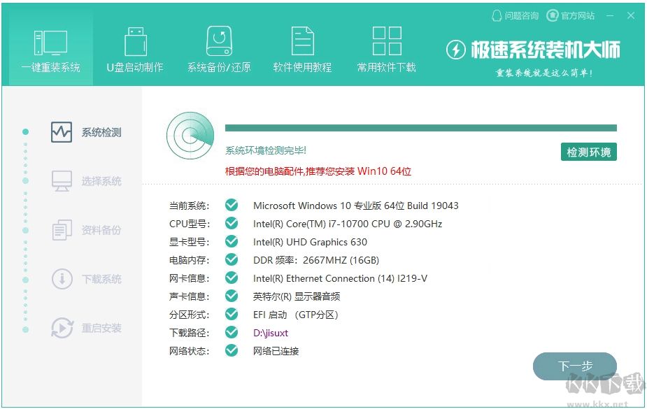 下載軟件完軟件后正常打開,程序會(huì)默認(rèn)檢測當(dāng)前系統(tǒng)環(huán)境,檢測完成后,點(diǎn)擊"下一步";