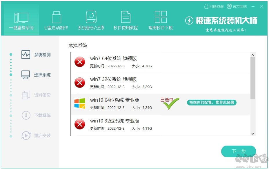 極速裝機(jī)大師已為您推薦適合電腦配置的系統(tǒng)版本,用戶也可選擇XP,Win7,Win8或Win10,點(diǎn)擊"下一步";