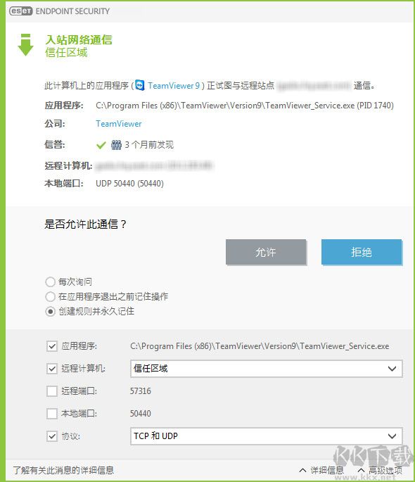 如果以交互模式檢測到新連接,并且沒有匹配的規(guī)則,將提示您允許或拒絕該連接。如果希望每次應(yīng)用程序嘗試建立連接時 ESET Endpoint Security 均執(zhí)行相同操作,請選中記住操作(創(chuàng)建規(guī)則) 復(fù)選框。
