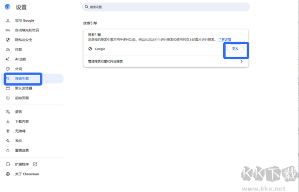 3、選擇【搜索引擎】這一欄,點(diǎn)擊【更改】。