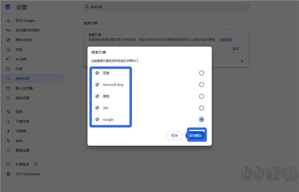4、用戶可更換為百度、搜狗、Microsoft Bing、360等引擎,選擇好點(diǎn)擊【設(shè)為默認(rèn)】即可。