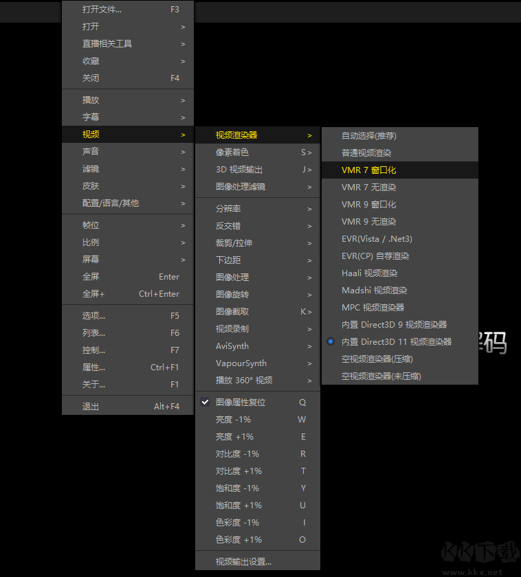 方法二:若“VMR 7窗口化”無效,可嘗試在視頻渲染器子菜單中選擇“內(nèi)置Direct3D 11視頻渲染器”。