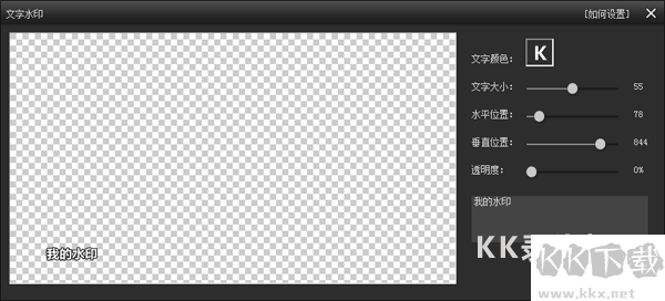 進(jìn)入軟件主界面 - 設(shè)置 - 水印添加,點(diǎn)擊"插入文字"或"插入圖片",初步調(diào)整參數(shù)與位置,點(diǎn)擊"確定"。