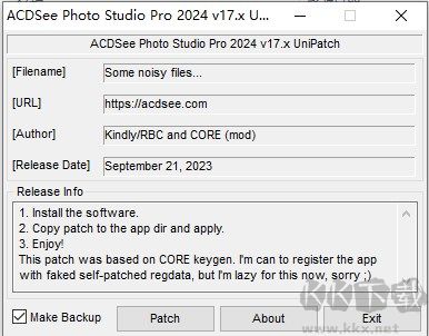 4、將補丁文件復(fù)制到ACDSee Photo Studio Pro 2024的根目錄下運行,點擊【patch】按鈕