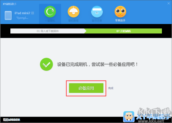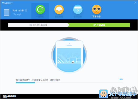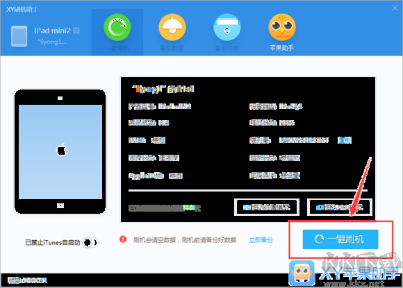 1、首先通過(guò)數(shù)據(jù)線將設(shè)備連接至電腦,啟動(dòng)XY蘋果助手程序,點(diǎn)擊“一鍵刷機(jī)”功能鍵。