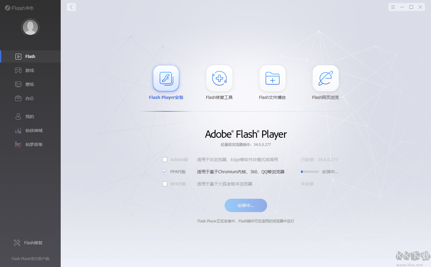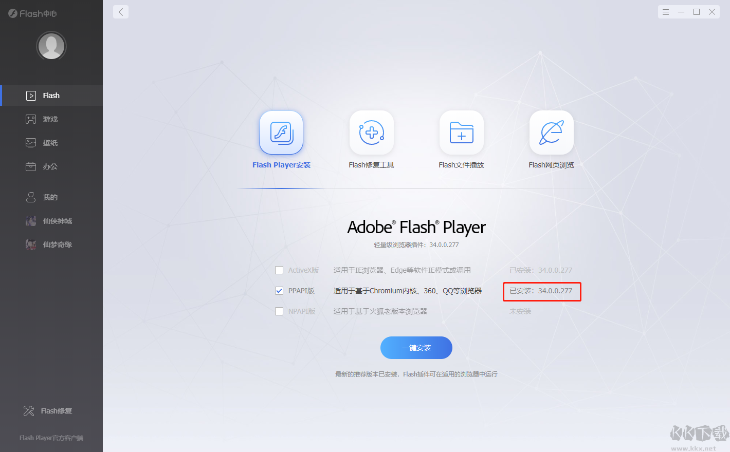 1、啟動(dòng)Flash中心,選擇“Flash”板塊下的“Flash Player安裝”;