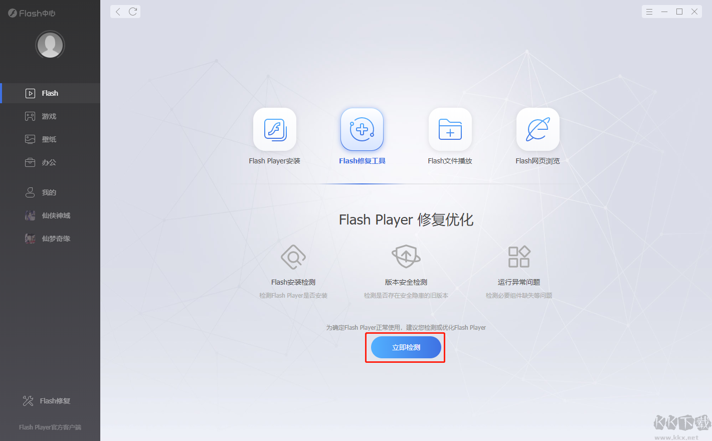 4、進(jìn)入“Flash修復(fù)工具”欄目,選擇“立即檢測(cè)”;