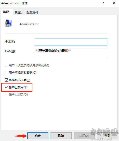5、取消“賬戶已禁用”勾選,點(diǎn)擊“確定”保存,即可解決。