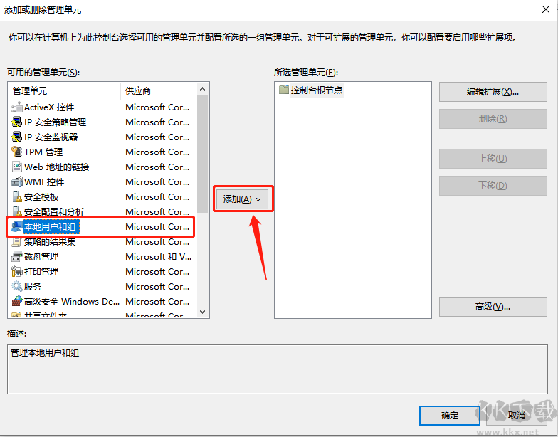 4、在彈出窗口中選中“本地用戶和組”,點(diǎn)擊“添加”;
